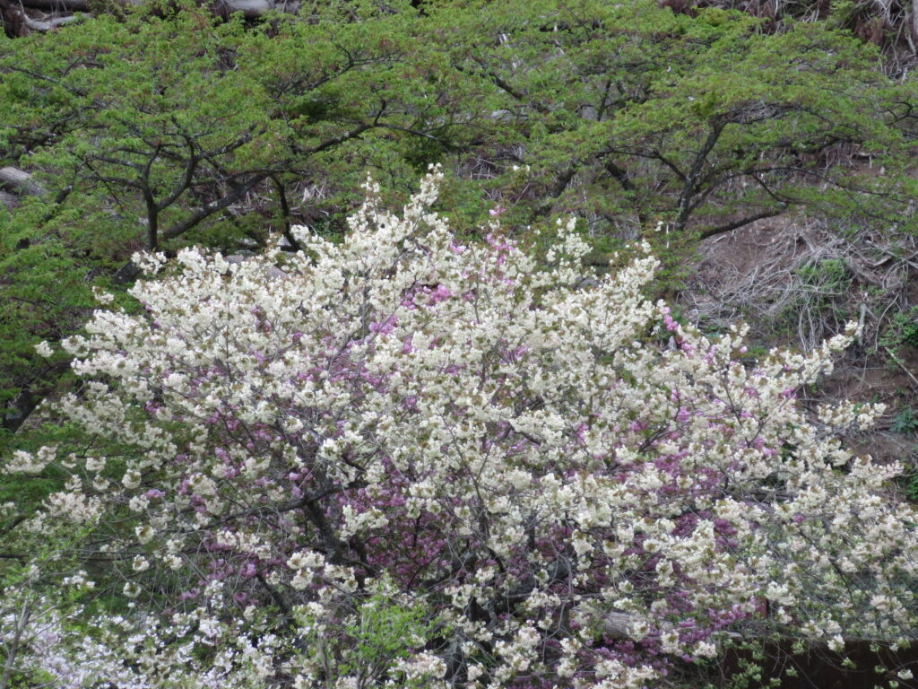 令和8年4月23日(木) カンザンに重なるウコン (駐車場南西隅) 背景は葉桜になったソメイヨシノ